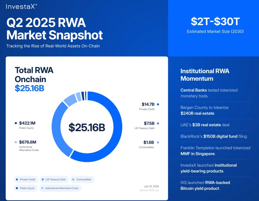 The tokenized Real-World Asset (RWA) market experienced remarkable growth, reaching over $25 billion in the second quarter of 2025. The surge was primarily driven by increased institutional demand for yield, transparency, and balance sheet efficiency, particularly within private credit, treasuries, and commodities. This represents a 245-fold increase from 2020 to 2025.