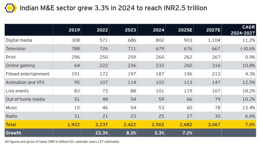 The EY leader outlined India’s M&E sector growth from INR 2.5 trillion in 2024 with projections to reach INR 2.7 trillion in 2025 (7.2% growth) and INR 3.1 trillion by 2027.