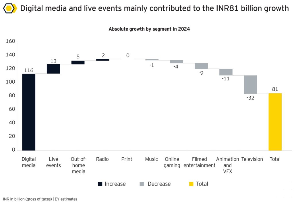 Nohwar highlighted that 2024 marked a historic shift where digital media overtook television to become the largest M&E segment, contributing 32% to overall revenues—the first time in 20 years that television was not the dominant segment.