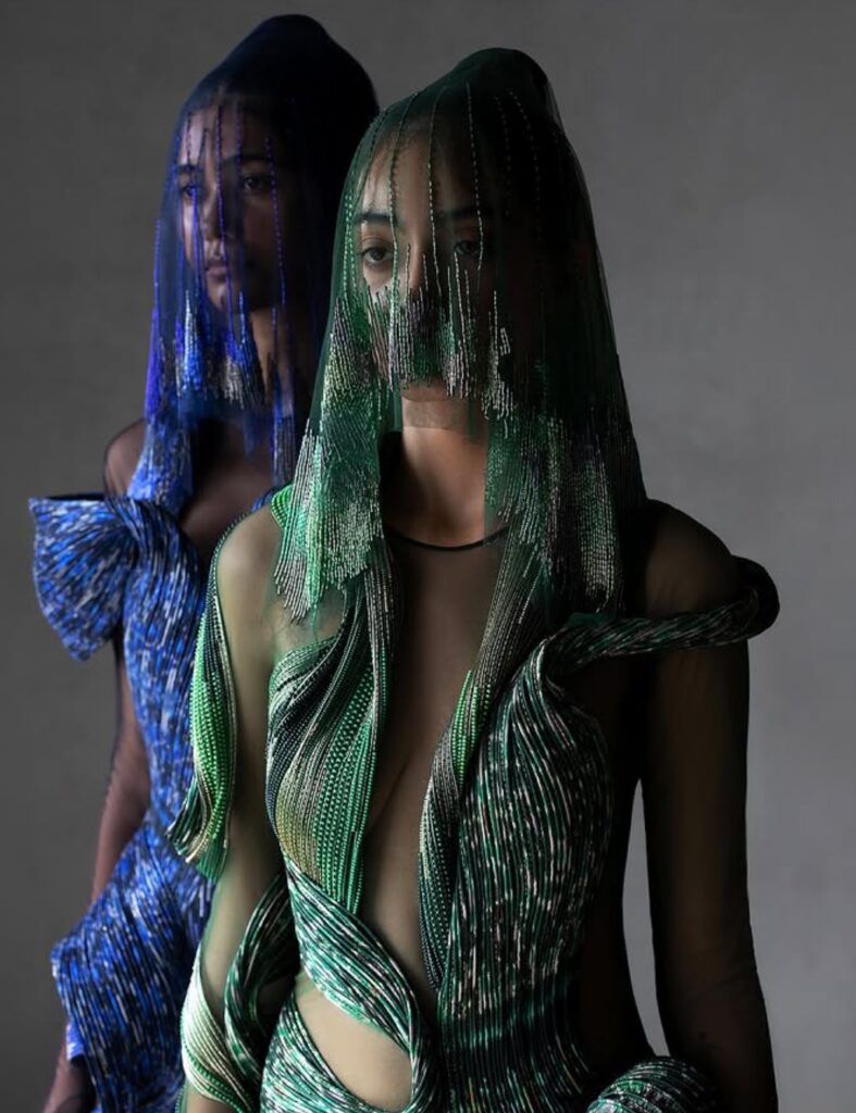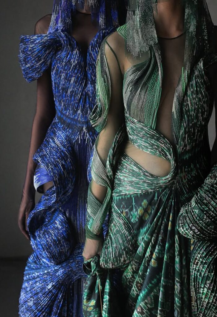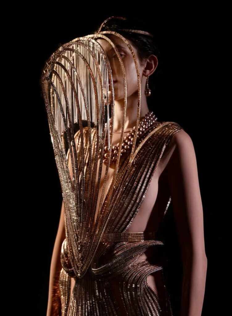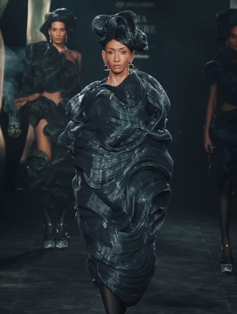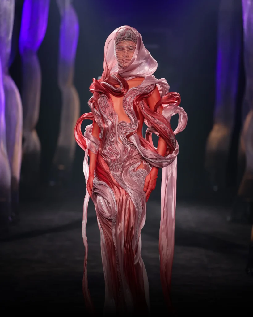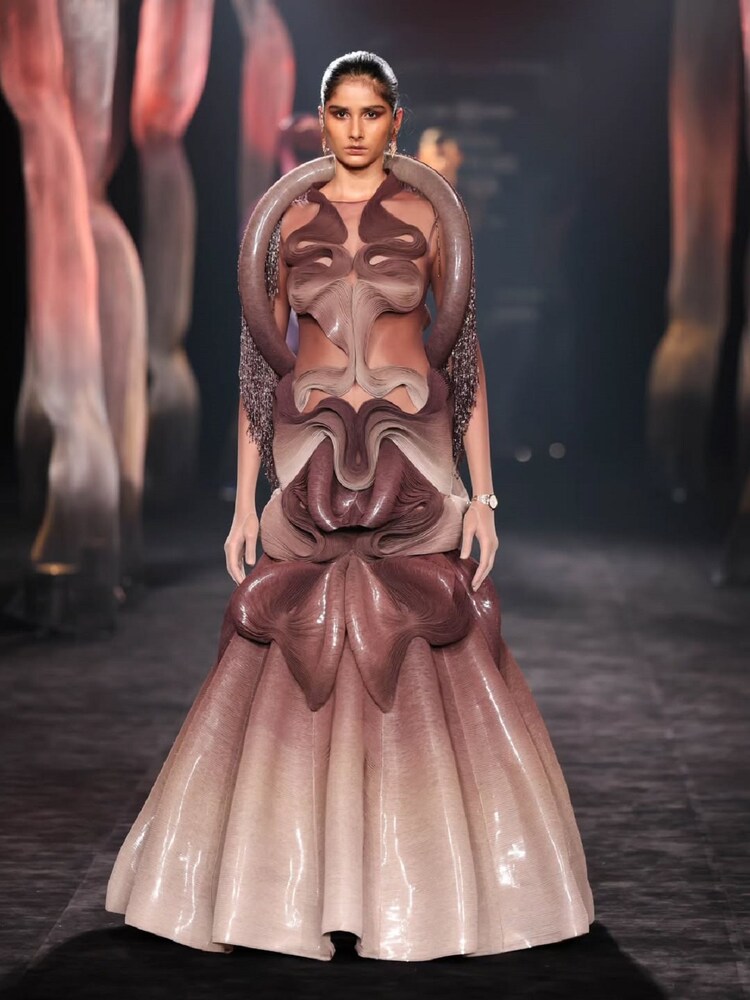 Sculptural silhouettes: Known for his signature polymer work, Aggarwal presented architectural, cocoon-like silhouettes that unfurled on the runway, mimicking the awakening of genetic identity. Other garments featured precise pleating and spiraling forms that echoed the twisting strands of DNA.