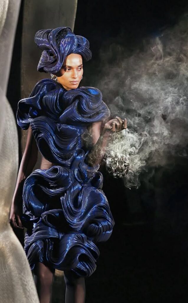 Sensory immersion: The collection was a multi-sensory experience. Accessories played a key role in the narrative, with bags carrying trailing incense sticks that left a fragrant smoke trail, creating a ritualistic and dreamlike atmosphere.