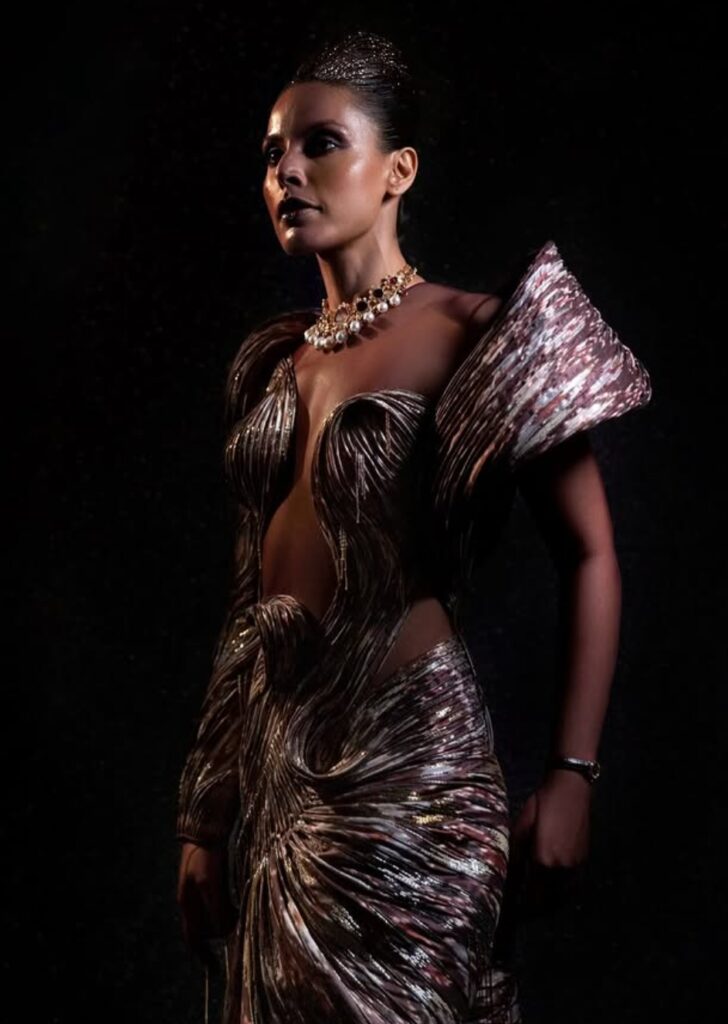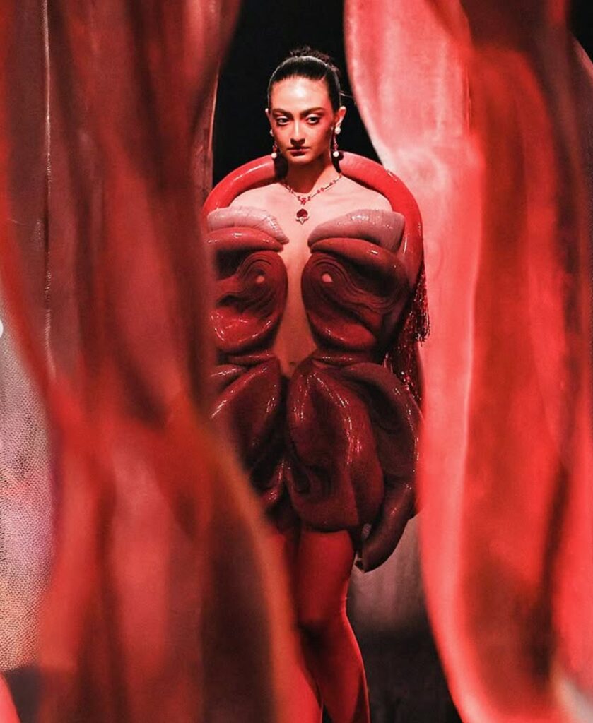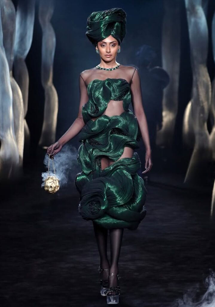 Arcanum, meaning “a secret” or “a hidden code,” serves as the perfect title for a collection that translates the invisible architecture of life into wearable art. Aggarwal structured the show into five conceptual chapters—Origin, Bloom, Pulse, Mutation, and Memory—each tracing a stage of biological narrative. This was a conscious move away from nostalgia, offering instead an analytical and futuristic view of identity and evolution. The double helix wasn’t merely a motif but a structural blueprint, appearing in swirling pleats, twisting silhouettes, and crystalline embellishments.