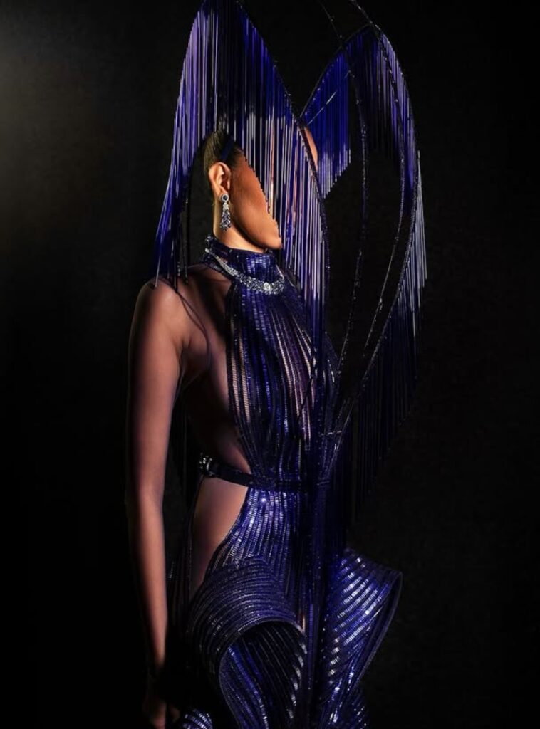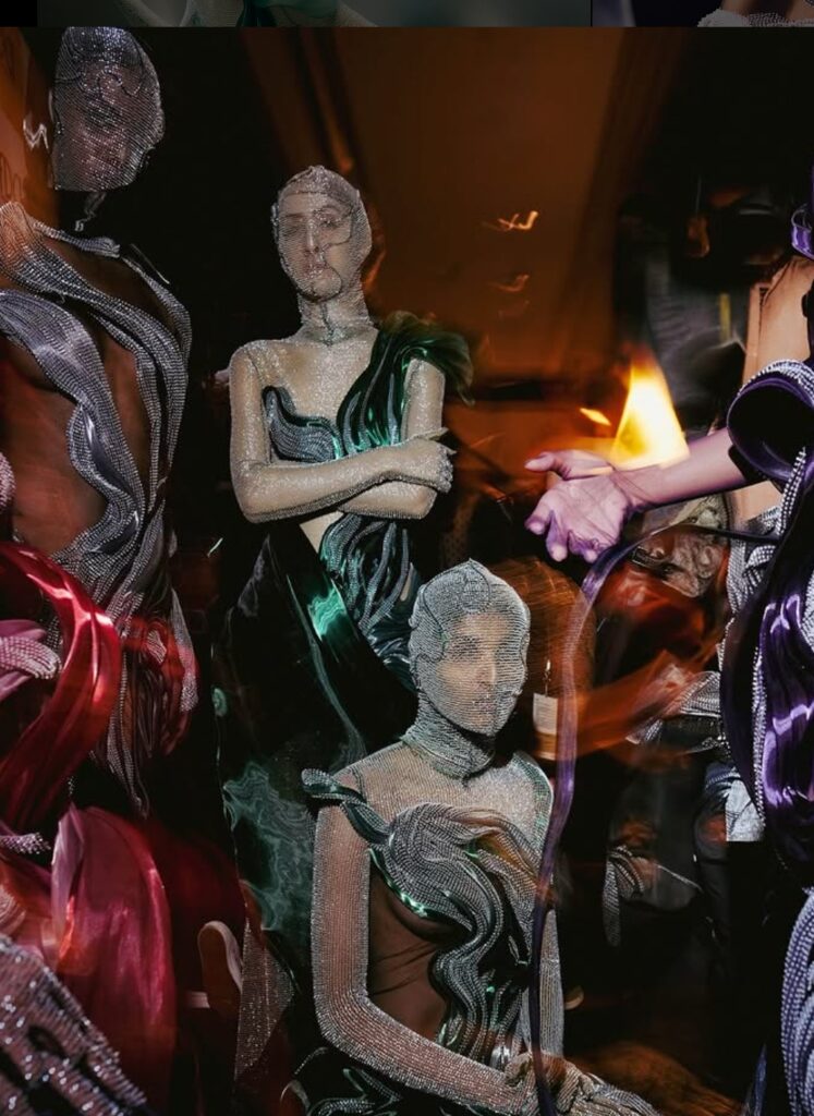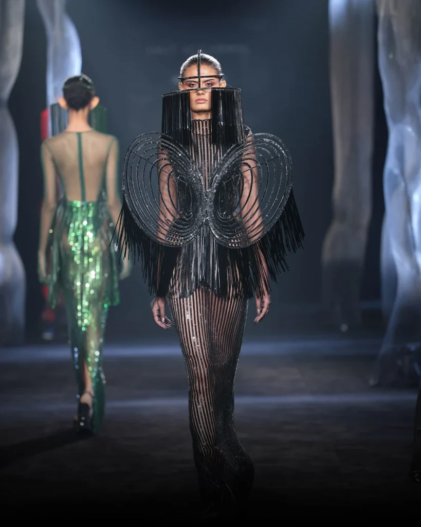 Futuristic palette: The collection’s color story was a striking mix of high-shine metallics, electric hues, and deep jewel tones. Shimmering silvers, vibrant purples, and emerald greens pulsed through the collection, adding to its otherworldly feel.