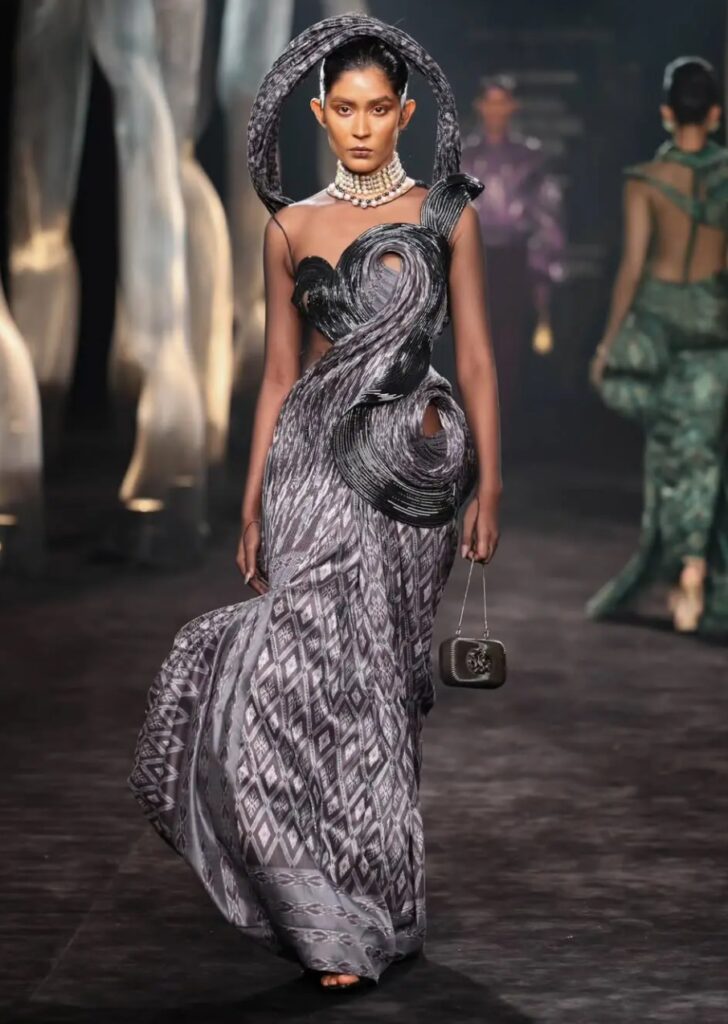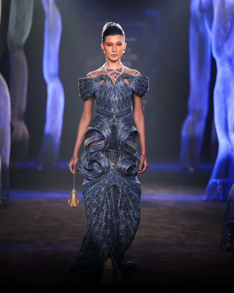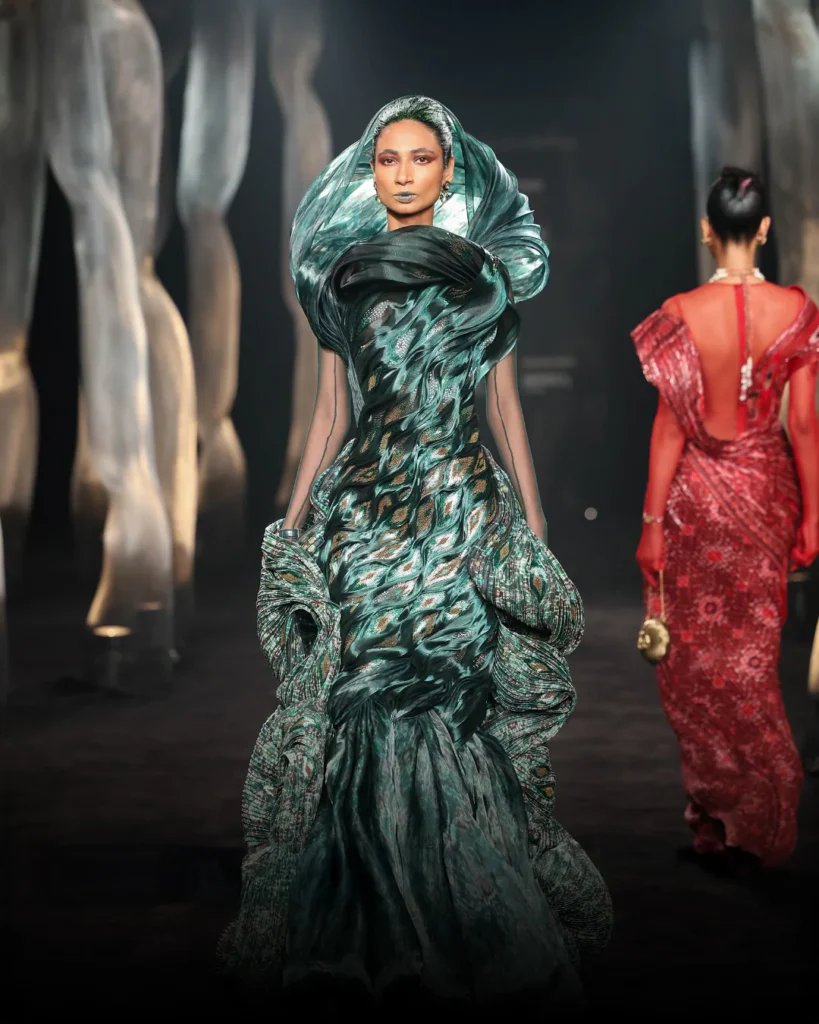 In the final chapter, Memory, Aggarwal linked the genetic memory stored in DNA to cultural memory, using the traditional ikat weaving technique as a metaphor. This powerful bridge between ancient craft and futuristic vision cemented the collection’s place in the evolving conversation of modern couture, proving that tradition can be honored by being recontextualized rather than simply repeated.