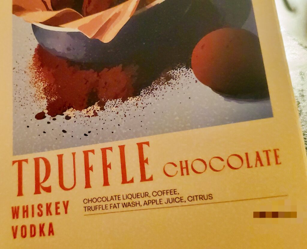 I love chocolate, I love truffle, equally, possibly both together, I ordered the TRUFFLE CHOCOLATE WHISKEY VODKA cocktail, which was an enchanting blend of premium spirits resulted in a truly indulgent libation. This Truffle Chocolate cocktail was a luxurious sensory experience that transformed dessert into an elegant drinkable masterpiece. The marriage of whiskey and vodka created a bold, smooth foundation that carried the rich complexity of chocolate liqueur and deep coffee notes with sophisticated balance. What truly elevated this cocktail to extraordinary was the truffle fat wash—an innovative technique that infuses the spirits with earthy, umami-rich truffle essence, adding an unexpectedly savory depth that makes each sip utterly captivating.