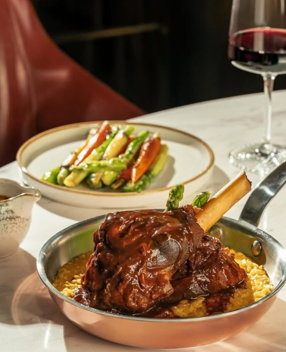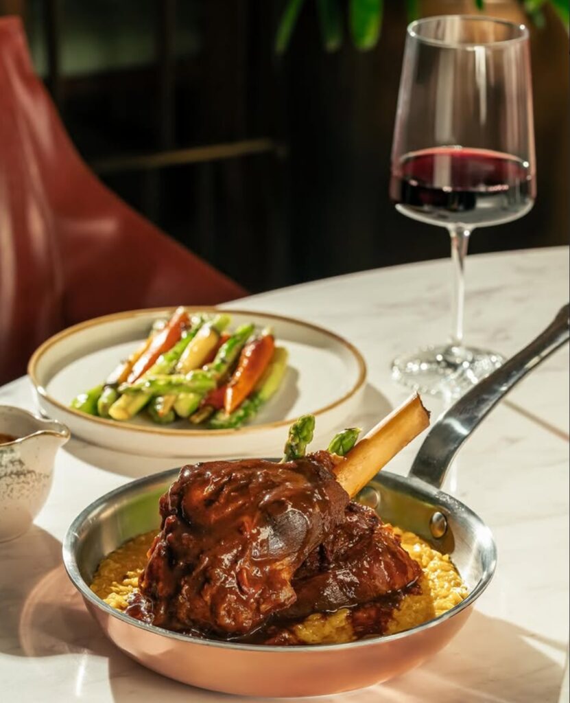 A luscious golden bed of saffron risotto serves as the perfect companion to the lamb, adding a vibrant color and luxurious flavor to the dish. The saffron’s distinctive taste and aroma elevate the risotto, creating a creamy, velvety texture that pairs beautifully with the rich lamb.