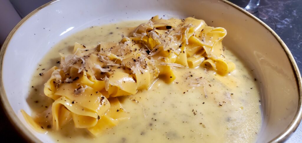 The Truffle Tagliatelle with Fresh Umbria Black Truffle, Salted Butter, and Parmigiano-Reggiano is a signature dish. This luxurious pasta dish featured fresh tagliatelle with authentic black truffles from Umbria, Italy (one of the world’s premier truffle regions), topped with an aerated salted butter foam and finished with Parmigiano-Reggiano cheese.