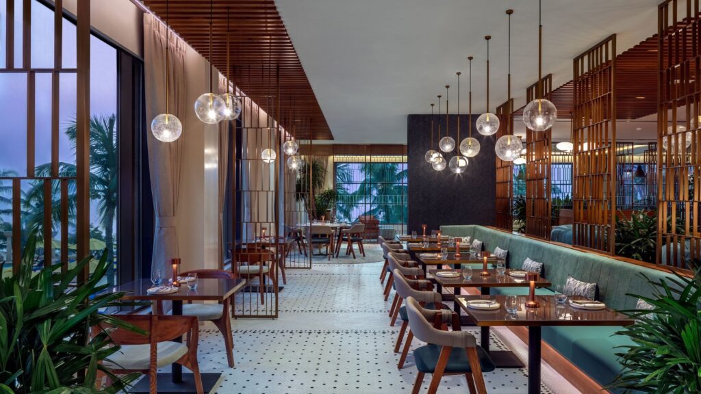 Mezzo Mezzo at JW Marriott Mumbai Juhu is an enchanting 170-seat dining haven, marrying European design elegance with the charm of Mediterranean coastal towns. The space showcases tiled floors, teal-hued furnishings, and verdant fiddle leaf figs that graze the ceiling, creating a chic ambiance for every occasion.