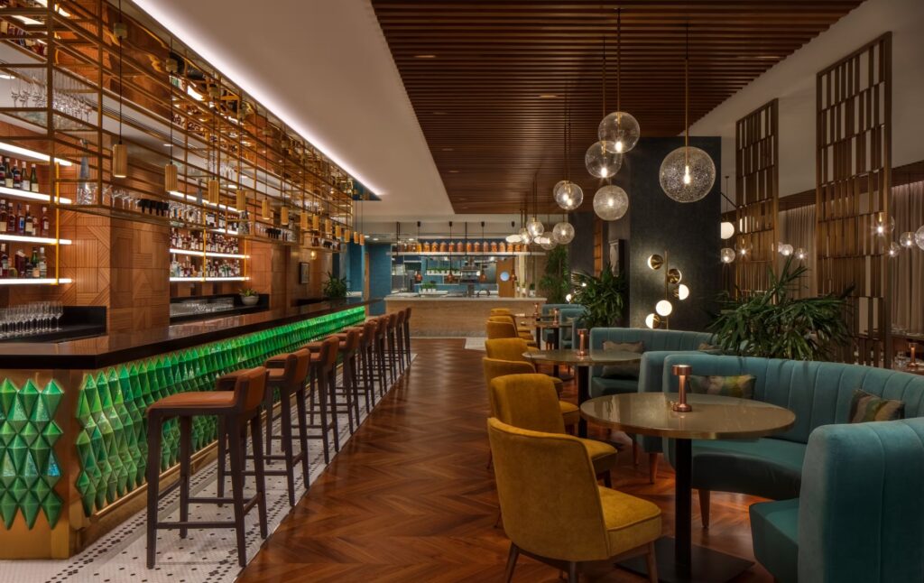 Mezzo Mezzo boasts a chic and dapper 15-seater bar that invites guests to indulge in cocktail-fuelled conversations against the backdrop of stunning sunset views. The sleek design of the bar, adorned with splashes of green, contrasting gold, and earthy hues, creates an inviting atmosphere that perfectly complements the restaurant’s modern European cuisine and signature culinary cocktails.