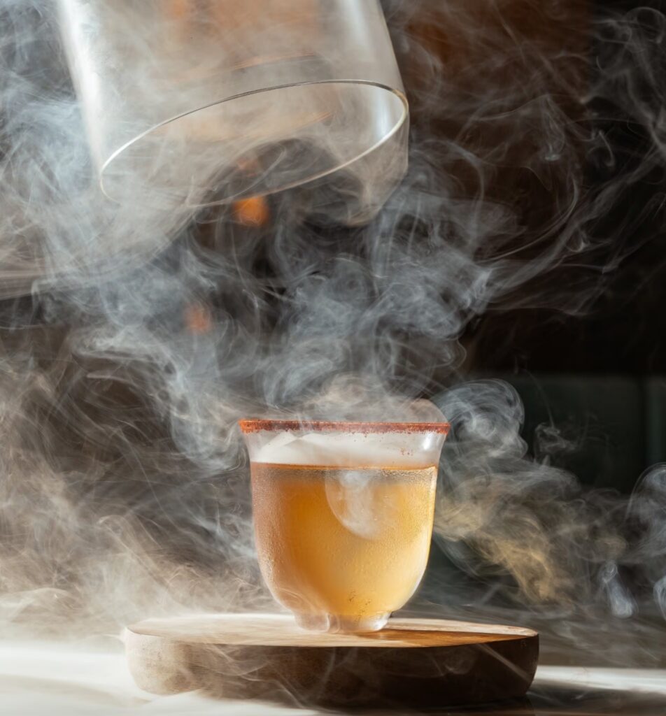 This audacious cocktail, the smoked salsa Picante, is not for the faint of heart, as the fiery picante heat creates an intoxicating dance on your palate that’s both seductive and thrilling. The citrus cuts through the intensity with refreshing brightness, while a whisper of orange adds subtle sweetness that tempers the flames just enough to keep you coming back for more.