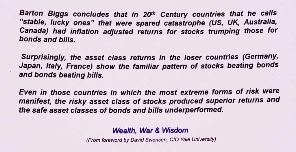 The book’s authors analyzed data from 15-16 countries between 1900 and 2000, revealing that equities generated an average return of 5-6% per annum higher than fixed income assets over this 100-year timeframe. This substantial difference in returns demonstrates the potential benefits of investing in equities for the long term.