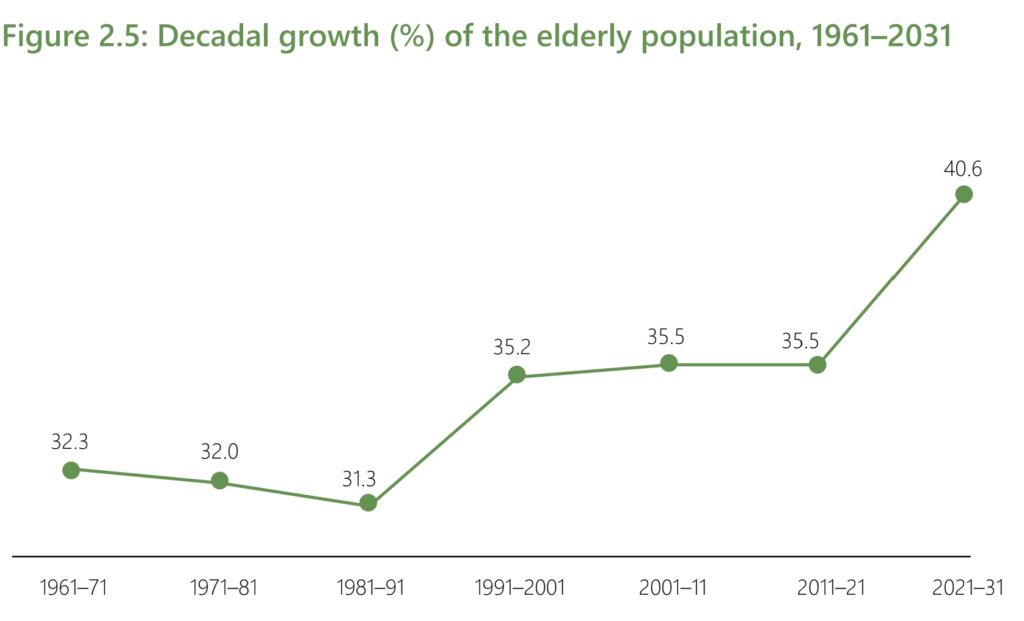 As highlighted in the United Nations Population Fund’s India Ageing Report 2023, the proportion of the elderly population is projected to rise from 10.5% in 2022 to 20.8% by 2050. This signifies an increase from 14.9 crore to a staggering 34.7 crore individuals in this age group. Notably, the elderly population is expected to surpass the number of children aged 0 to 15 years by 2046, marking a reversal in the age structure of a historically youthful nation.